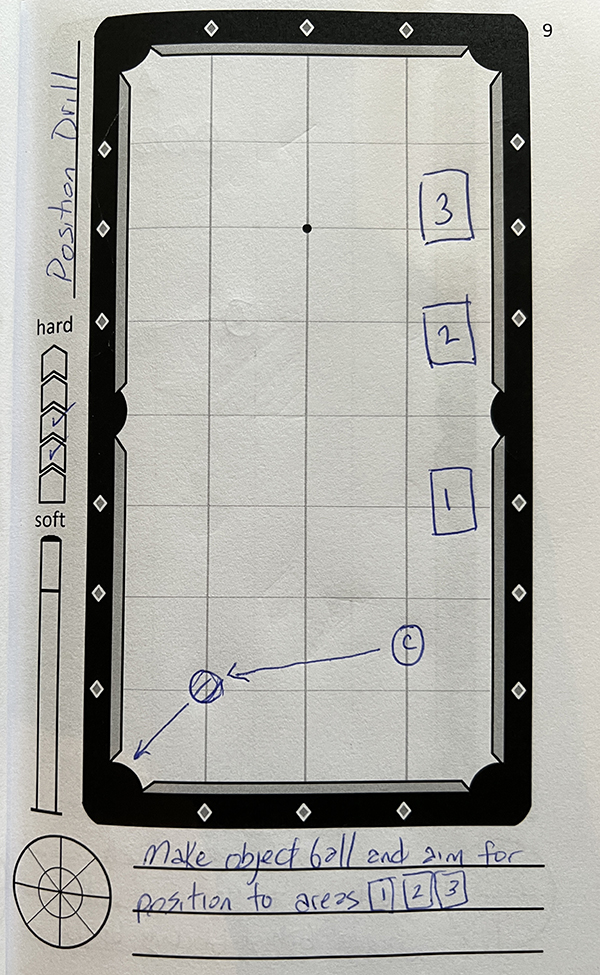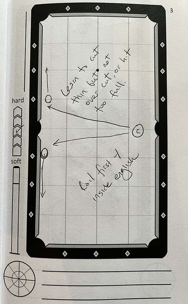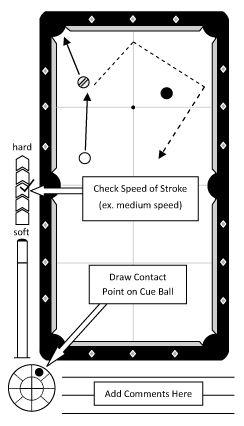 Using the pad is very easy and intuitive. The image shows an example of how to use the allotted spaces for ball speed, cue ball contact point (english), and comments.